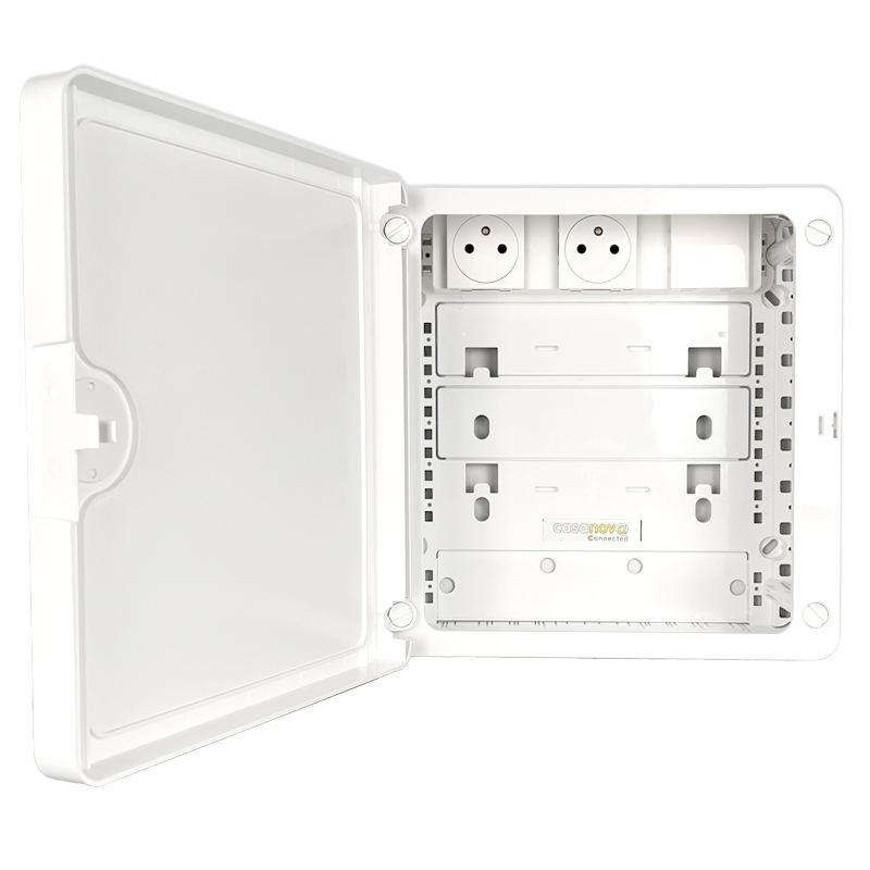 • 3 emplacements 45×45 pour personnaliser votre besoin en connectique courant fort et faible (dont deux sont occupés par des prises)